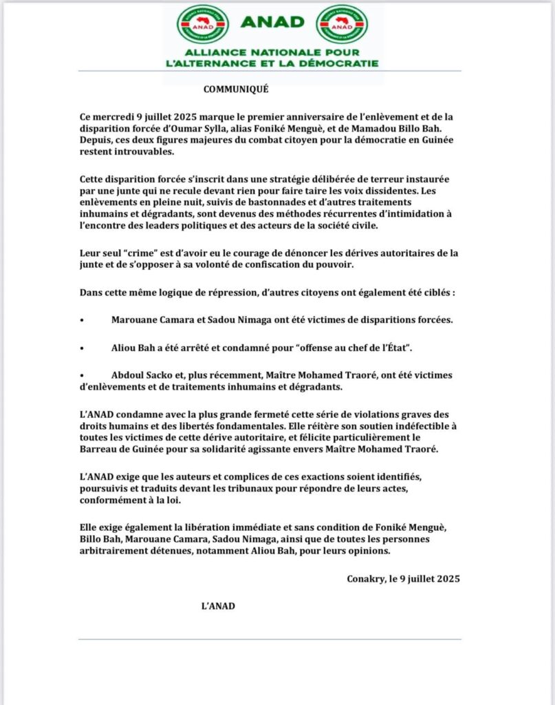 Ce 9 juillet 2025 marque un an depuis la disparition forcée d’Oumar Sylla, alias Foniké Menguè, et de Mamadou Billo Bah, deux figures emblématiques du combat pour la démocratie en Guinée. À cette occasion, l’Alliance Nationale pour l’Alternance et la Démocratie (ANAD) a publié un communiqué dénonçant la stratégie de terreur mise en place par la junte au pouvoir pour museler les voix dissidentes.