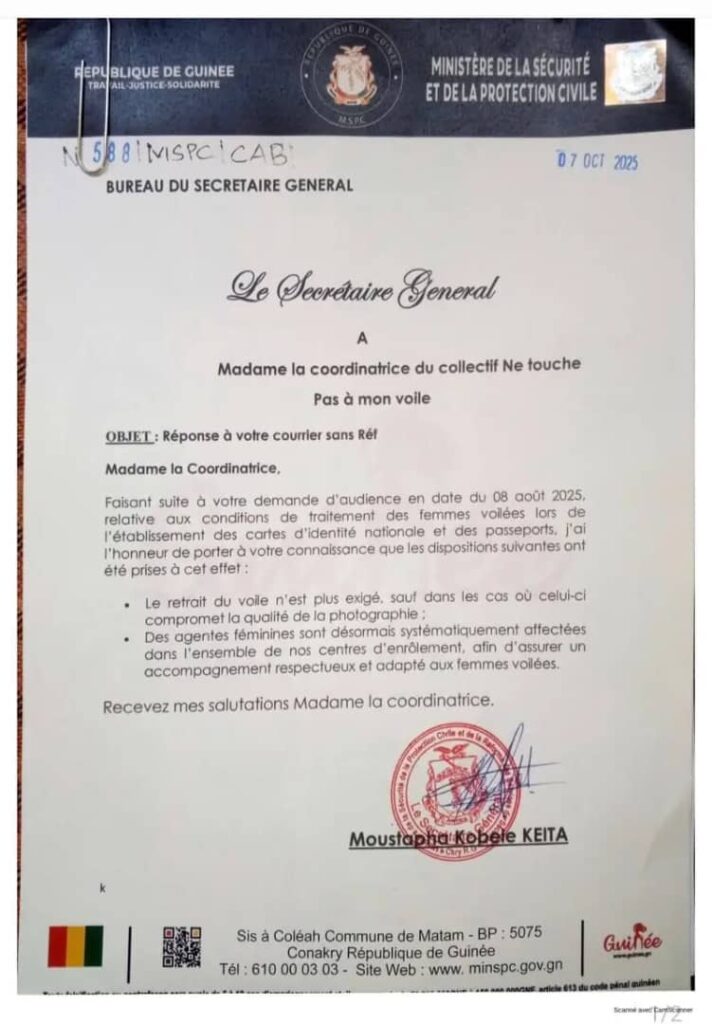 Dans une correspondance datée du 7 octobre 2025, adressée à la coordinatrice du collectif « Ne touche pas à mon voile », le Secrétaire Général dudit ministère, Moustapha Kobélé KEITA, a indiqué que de nouvelles dispositions ont été prises pour garantir un traitement respectueux des femmes voilées dans les centres d’enrôlement.