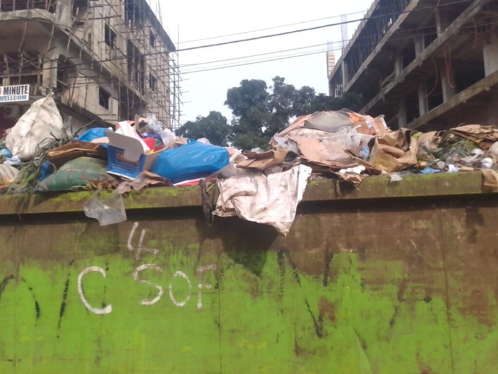 A priori, dans une ville aussi insalubre que Conakry, les bacs à ordures que l’on retrouve le long des principales voies publiques ou aux abords des marchés, sont le signe d’une volonté d’inverser la tendance. Mais ce n’est malheureusement pas toujours le cas. Ainsi, au bord de Sonfonia, les deux bacs à ordure rendent davantage la vie difficile aux habitants. L’odeur qui s’en dégage gêne les commerçants, les passants et les riverains. Souvent, les déchets débordent sur la route, transformant le marché en un gigantesque et gênant dépotoir à ciel ouvert.