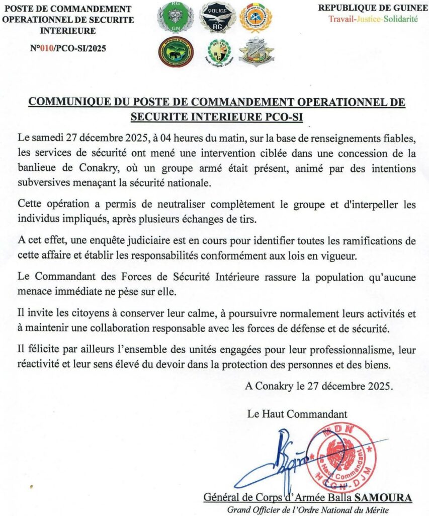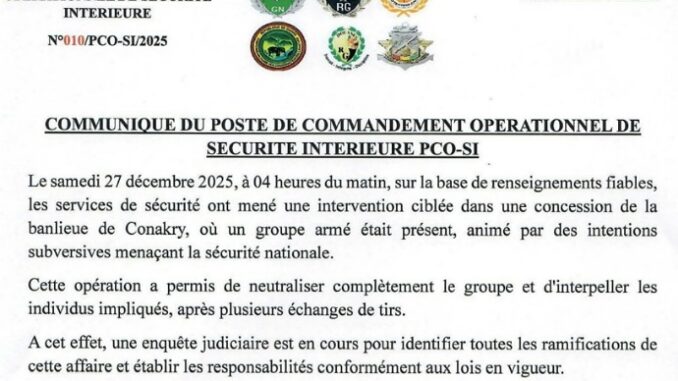 Le Poste de Commandement Opérationnel de Sécurité Intérieure (PCO-SI) a annoncé qu’une opération ciblée menée à l’aube du samedi 27 décembre 2025 dans la banlieue de Conakry a permis de neutraliser un groupe armé menaçant la sécurité nationale.