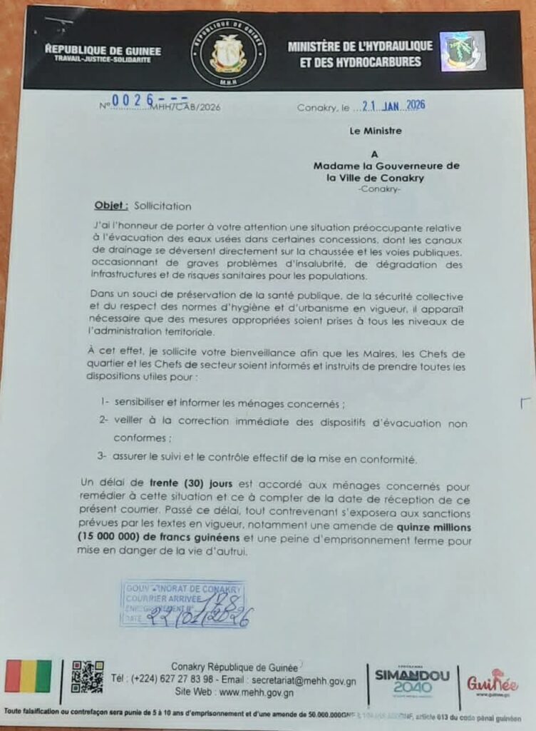 Le Gouvernorat de Conakry lance un ultimatum de 30 jours aux ménages évacuant illégalement leurs eaux usées sur la voie publique. Passé ce délai, la tolérance zéro sera de mise : entre amendes record et peines de prison, les autorités sortent l’artillerie lourde pour nettoyer la capitale.