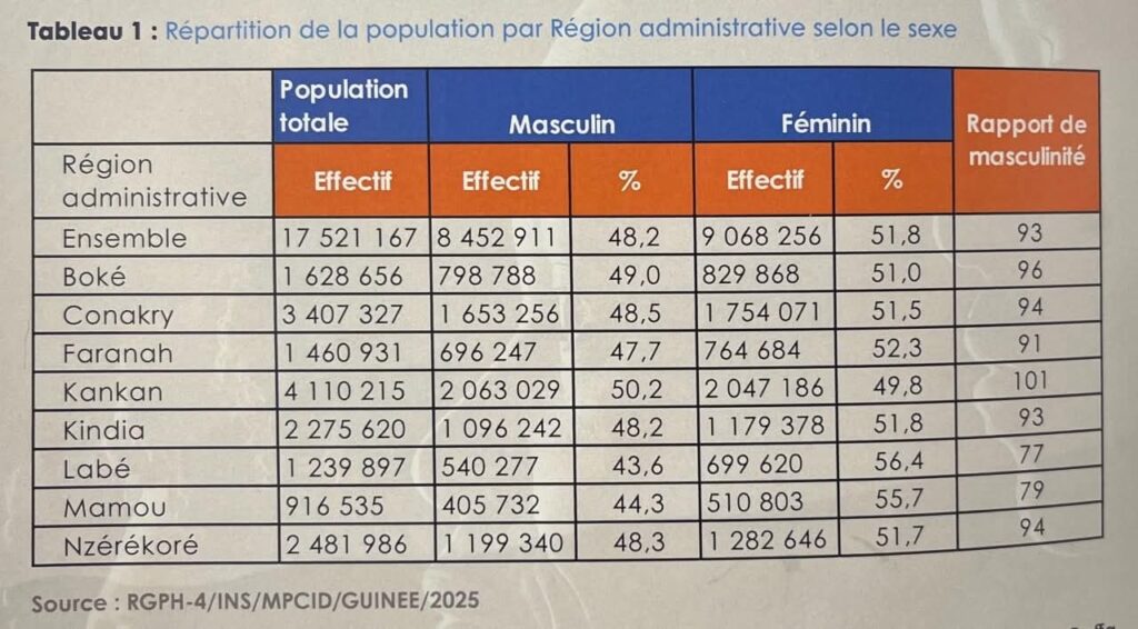 - Kankan (4 110 215 hab.) : La région la plus peuplée. Fait notable, c’est l’une des rares zones où les hommes sont légèrement plus nombreux que les femmes.