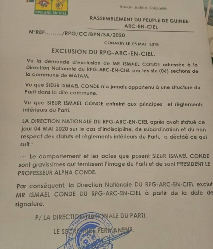 Une démarche pour l’exclusion de cet élu de la commune de Matam en banlieue de Conakry pour indiscipline, insubordination et non-respect des statuts du RPG Arc-en-ciel a été entamée par des responsables du RPG Arc-en-ciel. C’est désormais chose faite. L’annonce a été faite ce mardi 5 mai 2020.